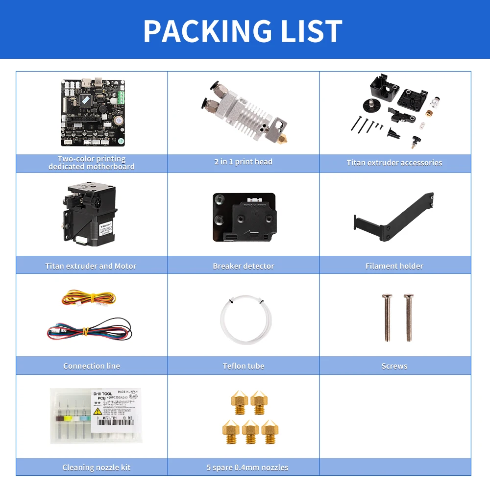 1 x kit double extrusion cyclope (2 x pneufit, 1 x dissipateur, 1 x gorge, 1 x bloc de chauffe, 6 x buses 0,4mm.)